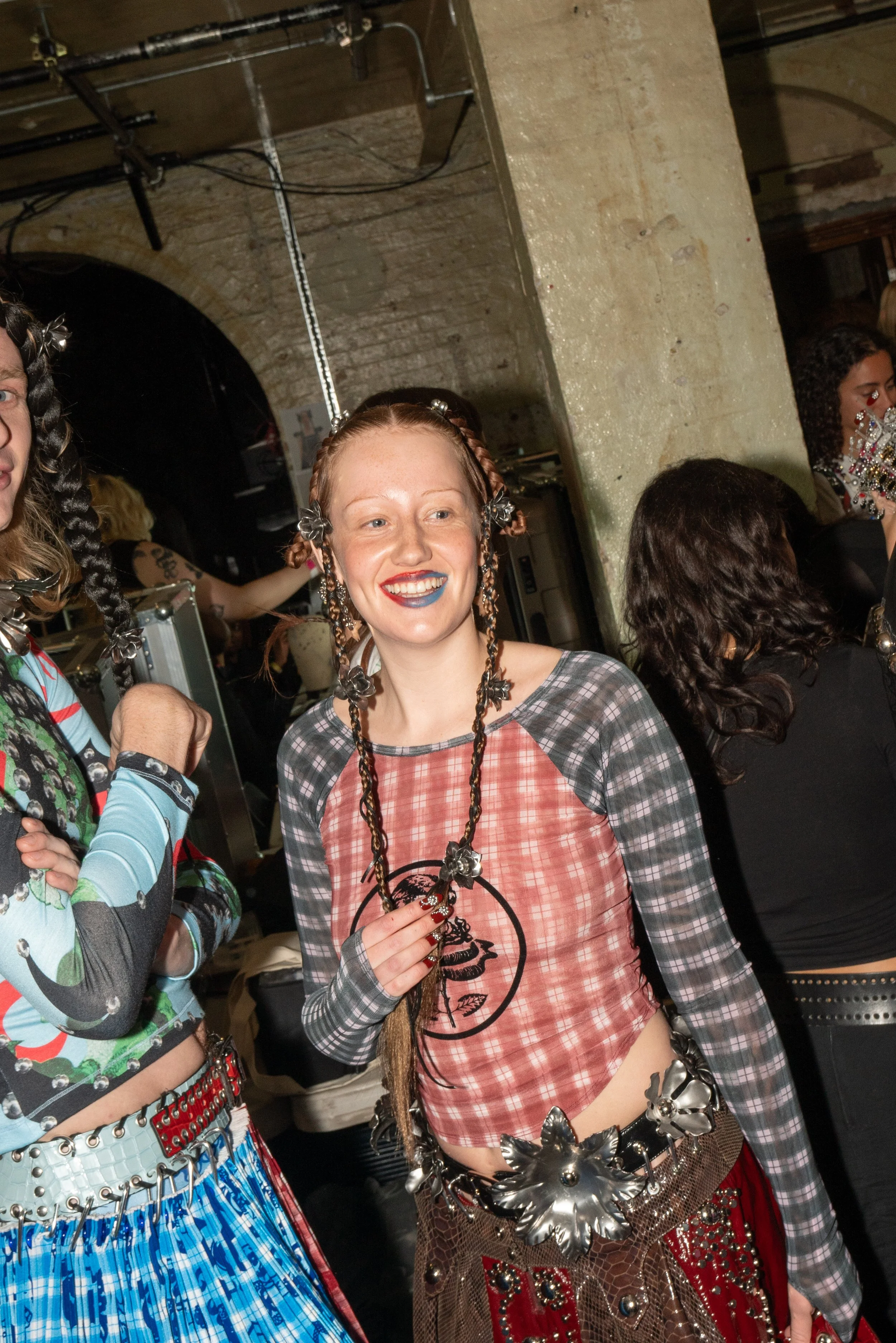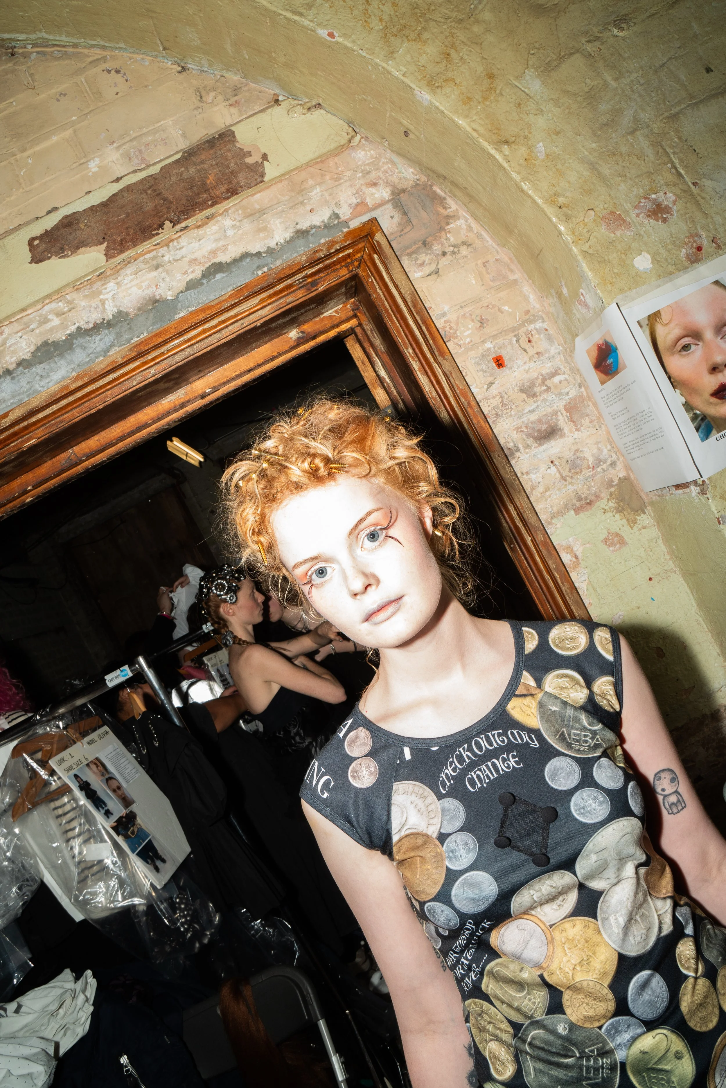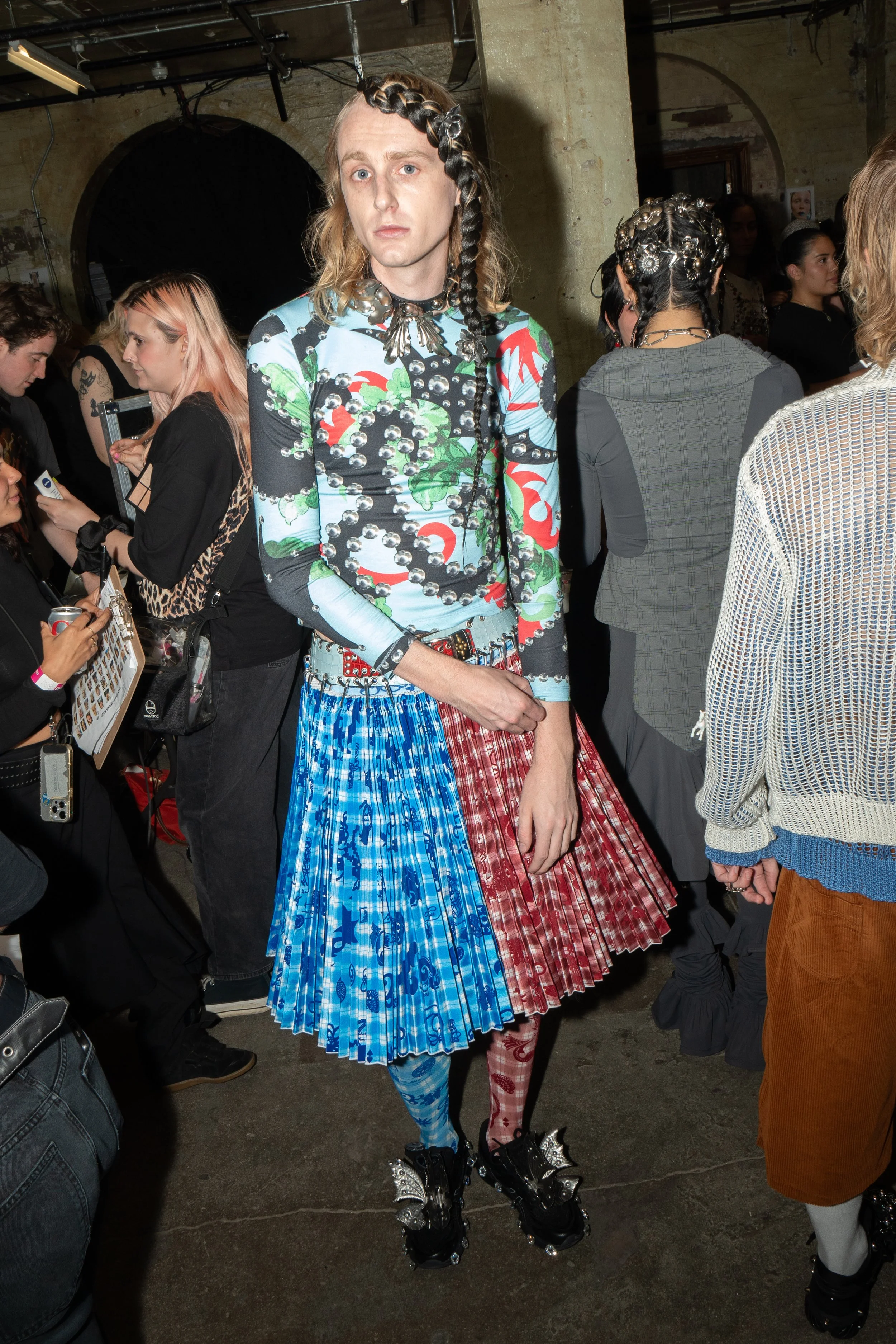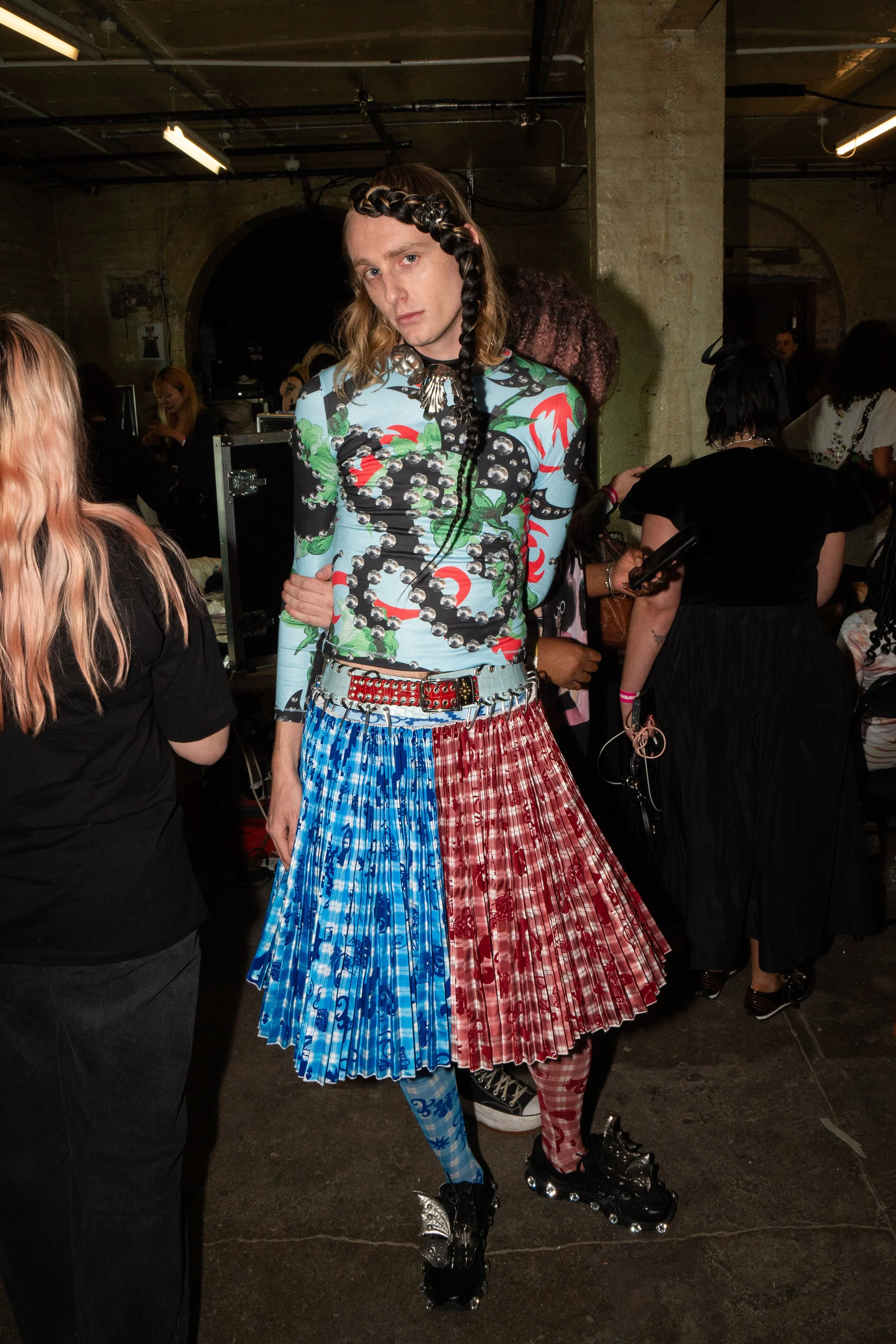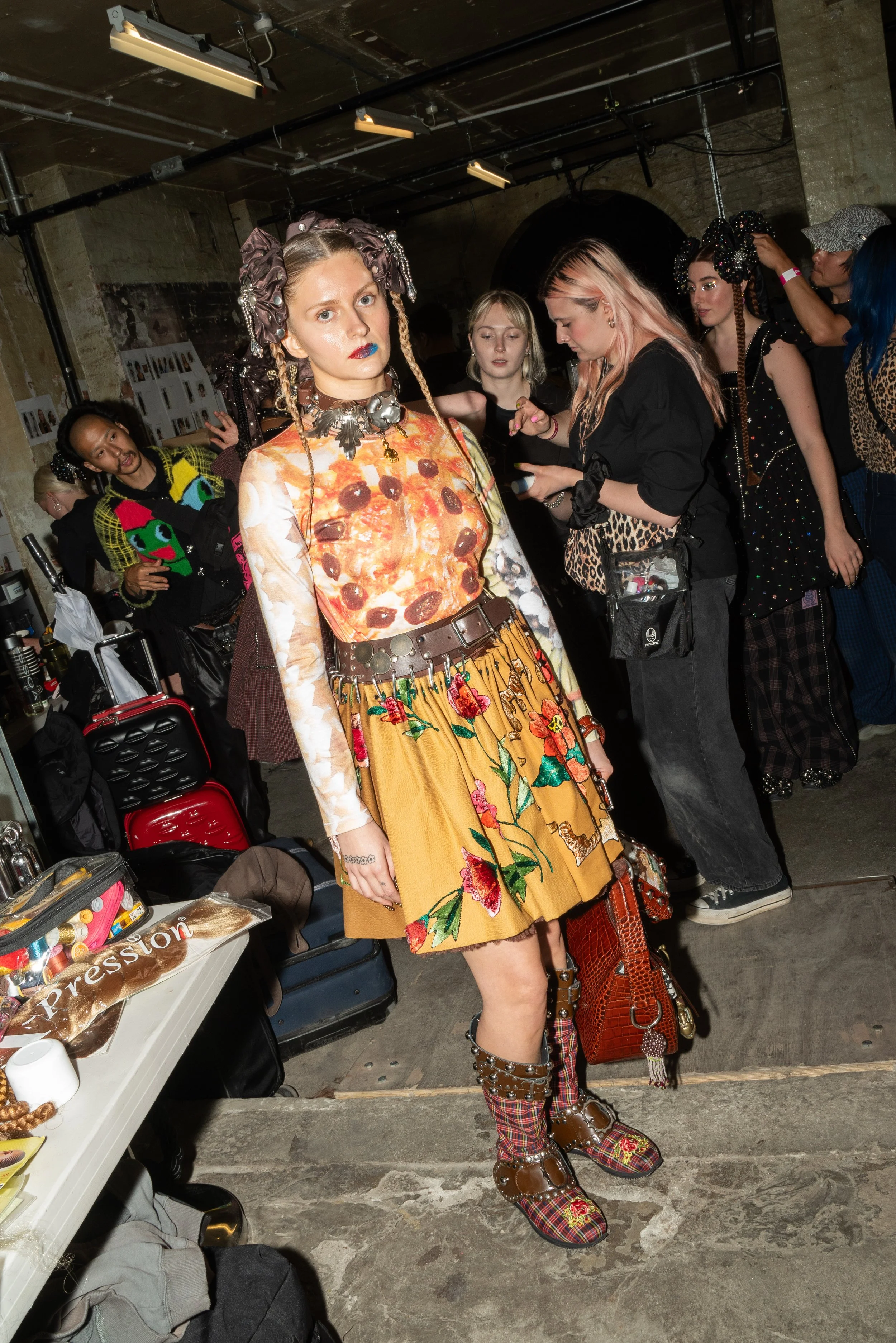 A woman with colorful makeup and an eclectic outfit, featuring pizza-patterned top, floral skirt, and tartan boots, posing backstage with other models and staff in a backstage area.