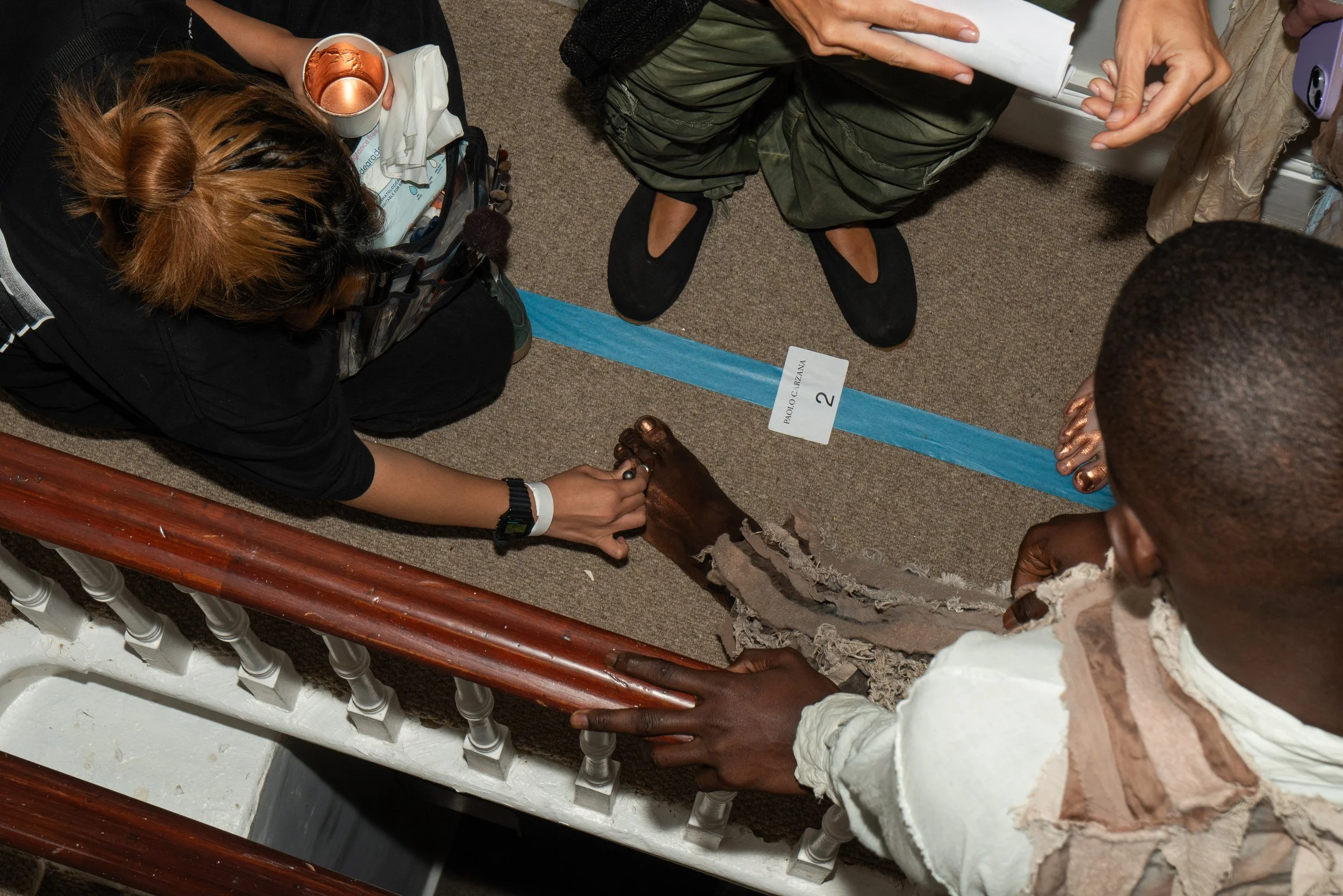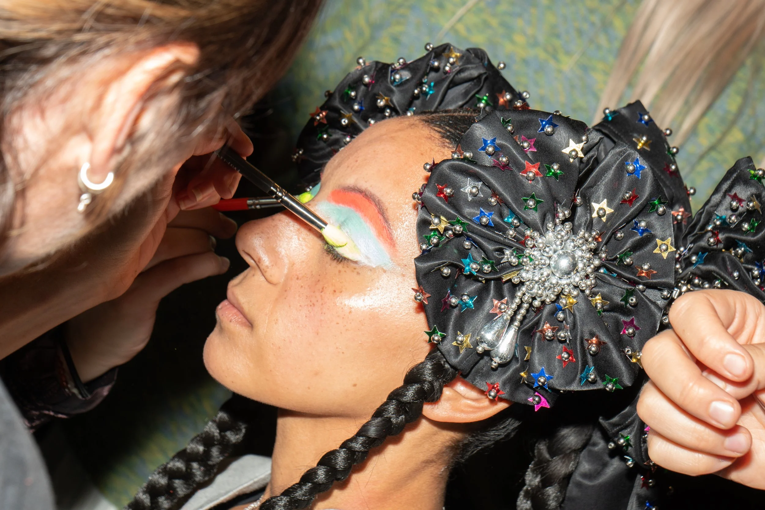 A woman with colorful, jeweled hair accessories is getting her makeup done by a makeup artist at a backstage area.