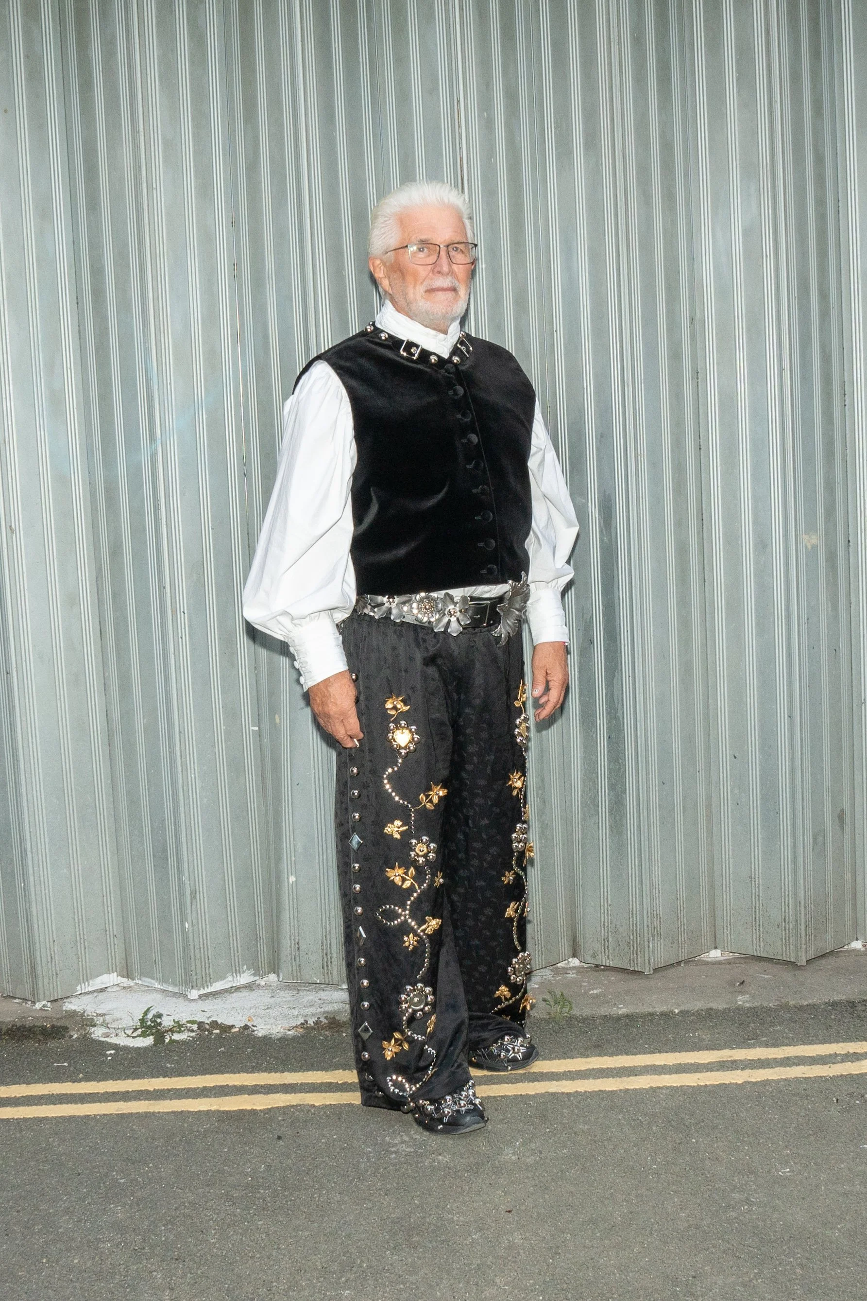 An elderly man with white hair and glasses standing outdoors against a metal wall. He is wearing a black velvet vest with silver embellishments over a white shirt with puffy sleeves, black pants with gold and silver embroidery, and ornate black shoes