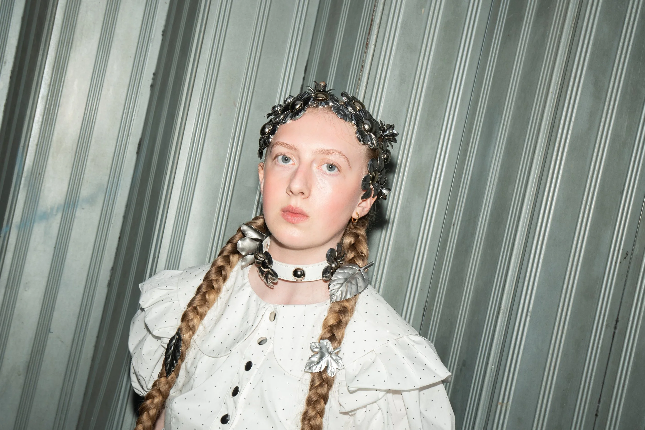 A young woman with light skin, blonde hair in two braids, wearing a black floral headpiece, a choker with metallic leaves, and a white blouse with black buttons, standing in front of a metallic wall.