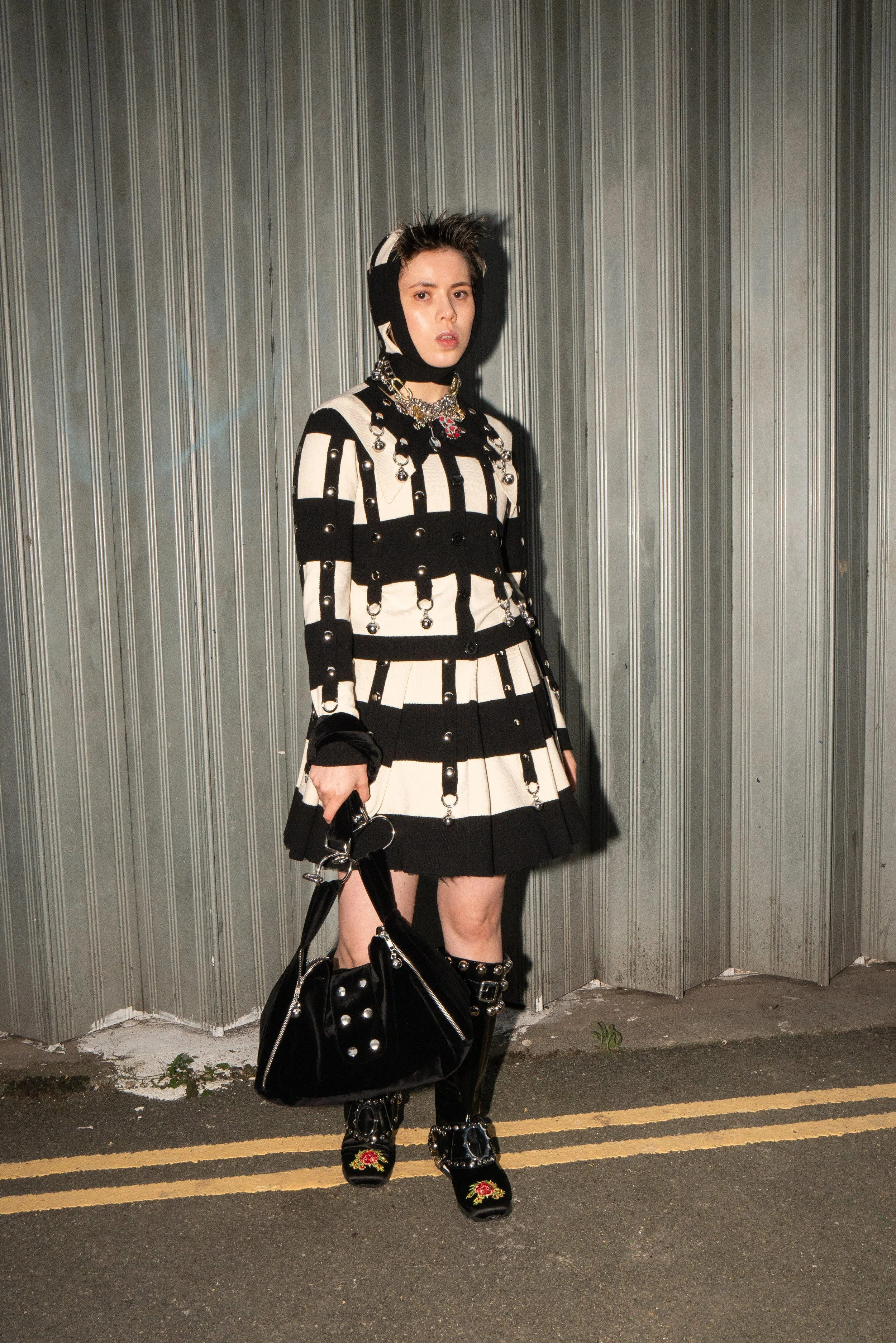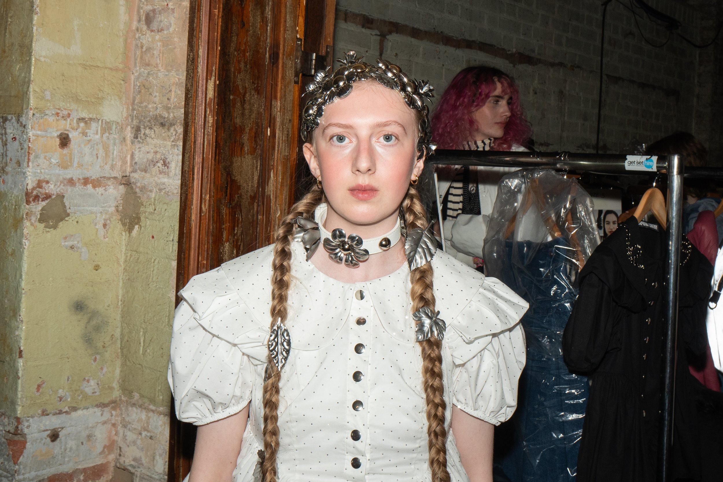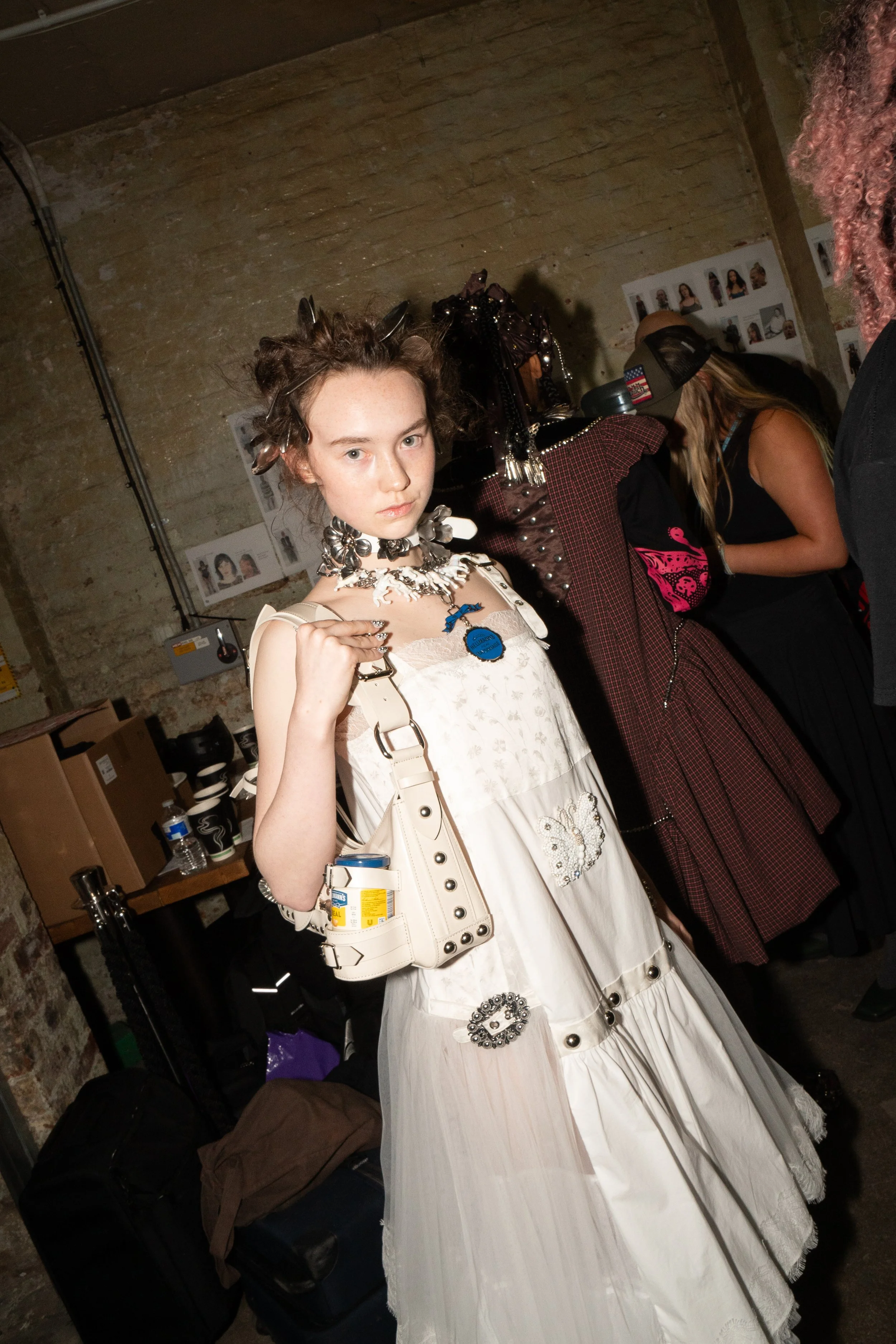 A young woman in a corset-style top and a sheer, pleated skirt with a choker and an off-white bag, standing in a backstage area with photos on the wall.