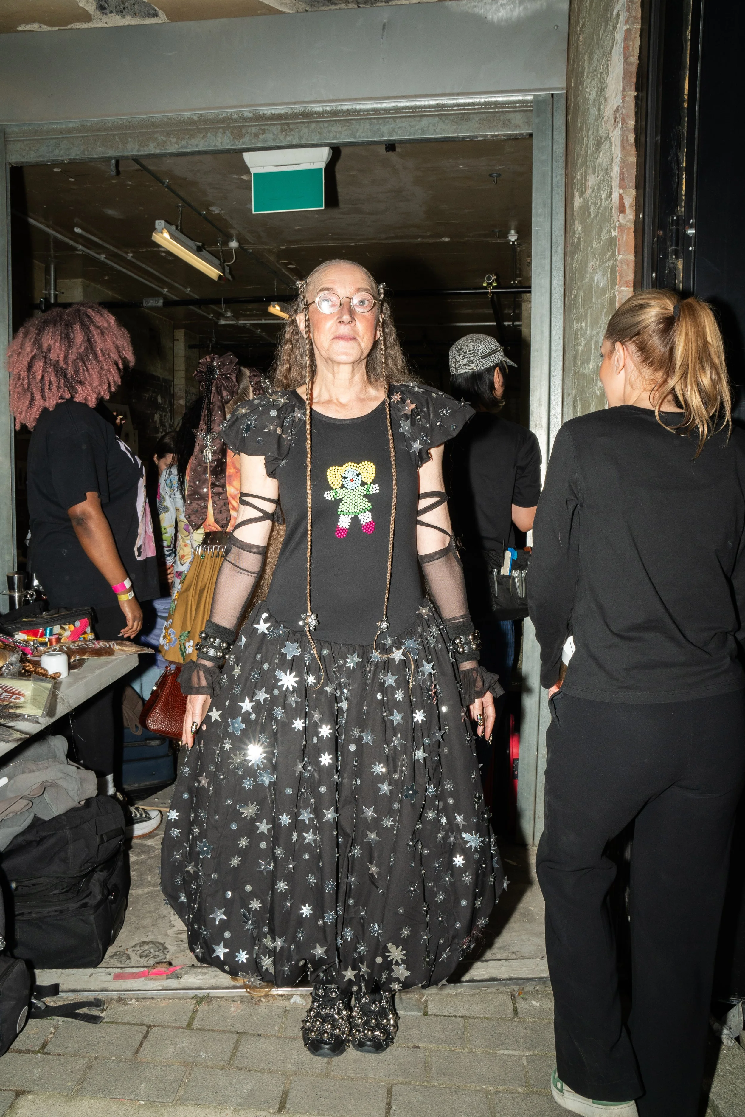 A woman dressed in a star-embellished black skirt, mesh sleeves, and a black top with a pixelated girl graphic, standing in a backstage area with others and accessories around.