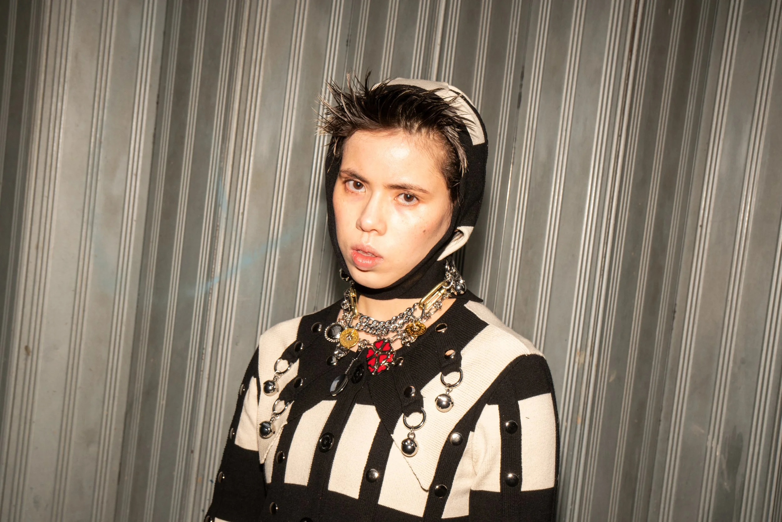 A person with short dark hair styled spiky, wearing a black and white striped hooded cardigan with metal embellishments, layered necklaces including chains and a red heart pendant, standing in front of a metallic corrugated wall.