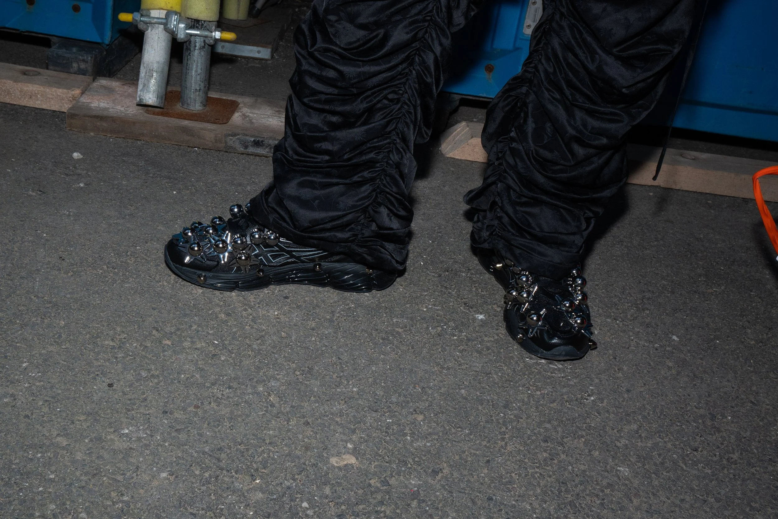 Close-up of someone's feet wearing black athletic shoes with metallic spikes, black baggy pants, sitting outdoors on a pavement near construction or industrial equipment.