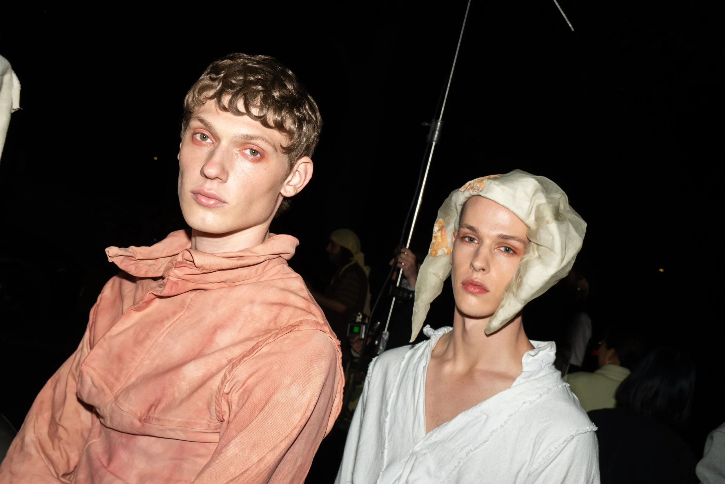 Two models with artistic makeup and head coverings posing at a fashion event, one in a peach-colored garment and the other in a white outfit with a fabric headpiece.
