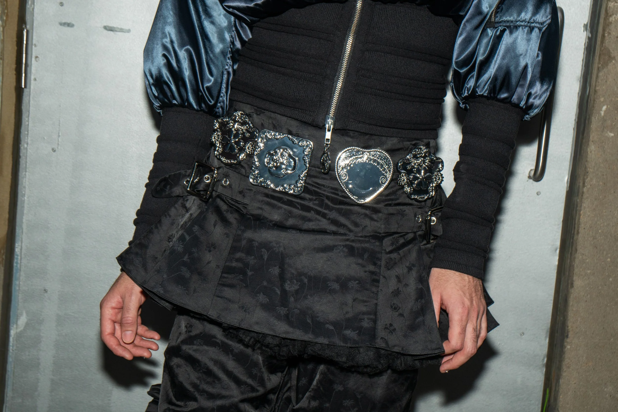 Close-up of a person's midsection wearing a black zip-up top with ruched sleeves, a black layered skirt or shorts, and a wide decorative belt with large ornate metallic flower and heart-shaped embellishments.