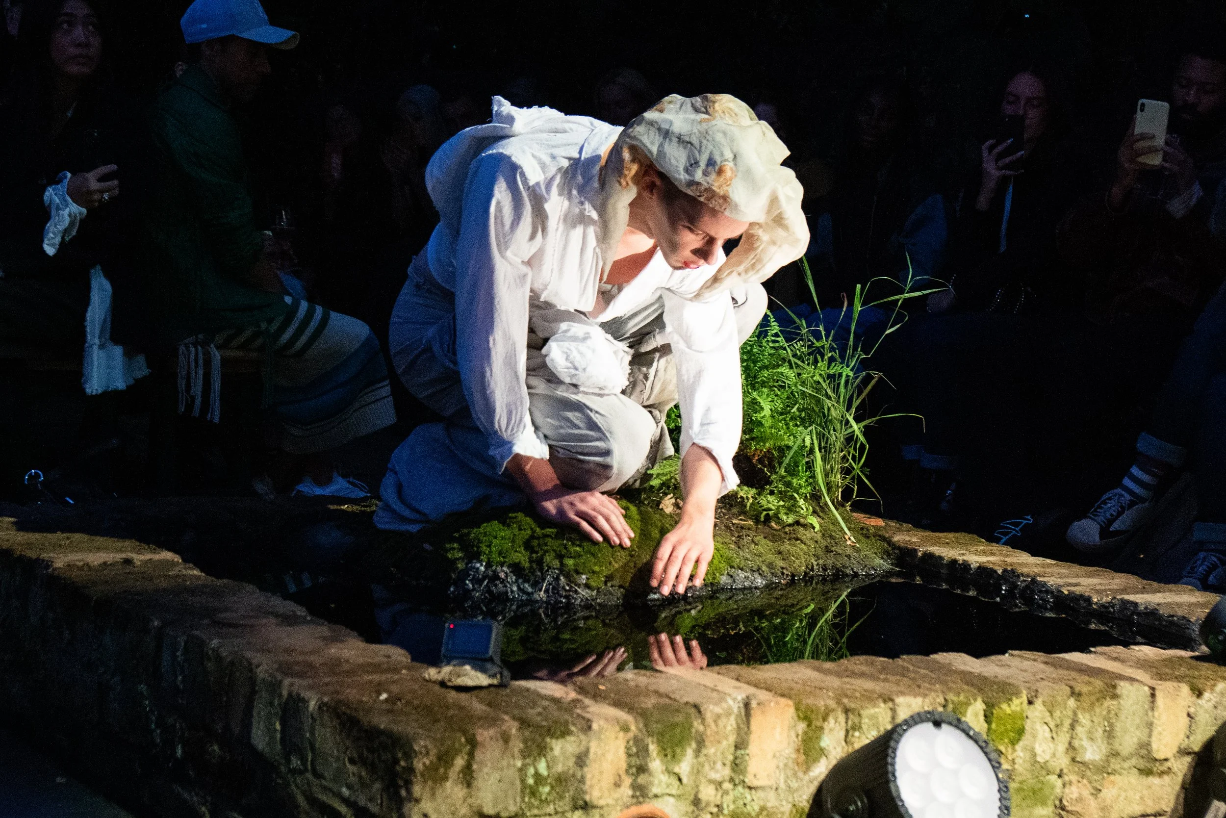 A person dressed in historical costume depicting early colonial or pioneer attire kneels by a small water feature, touching the water with their hand, while surrounded by an audience watching and capturing the moment.