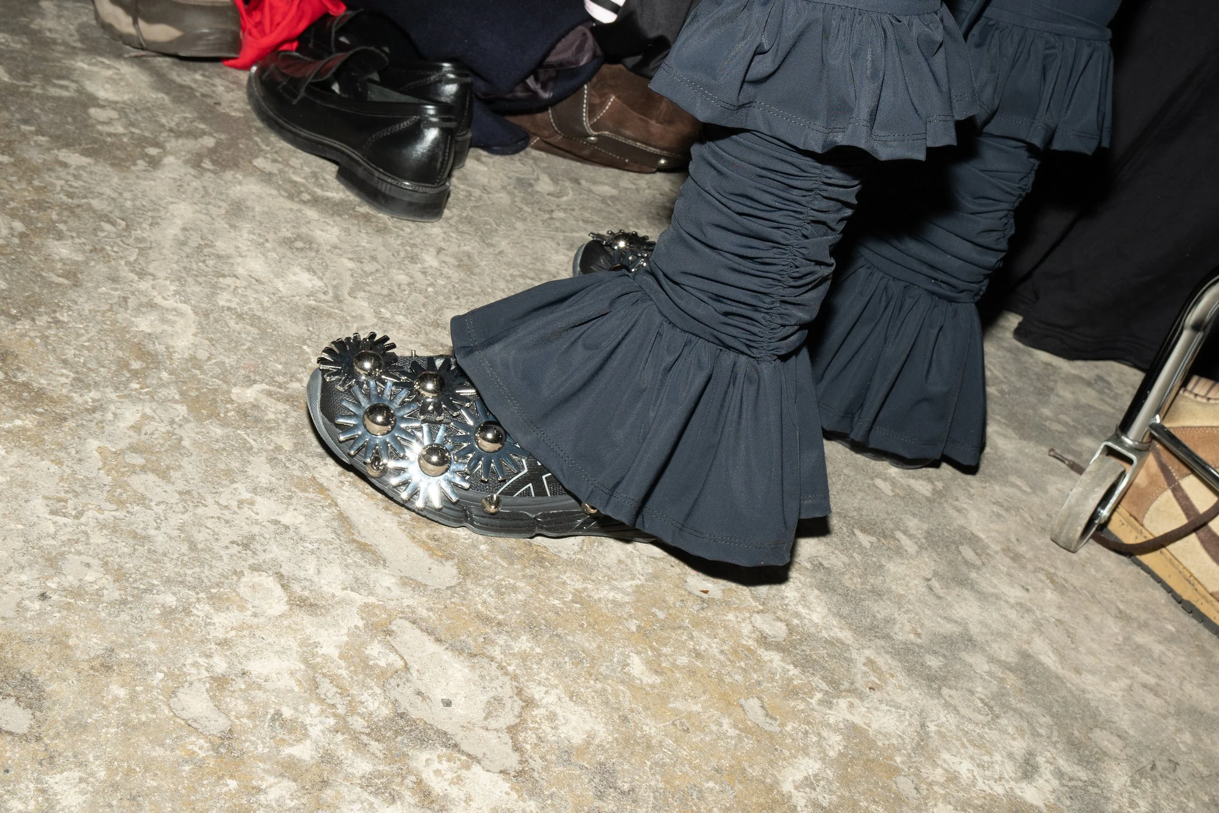 Close-up of three people wearing black shoes decorated with metallic beads, standing on a paved ground.